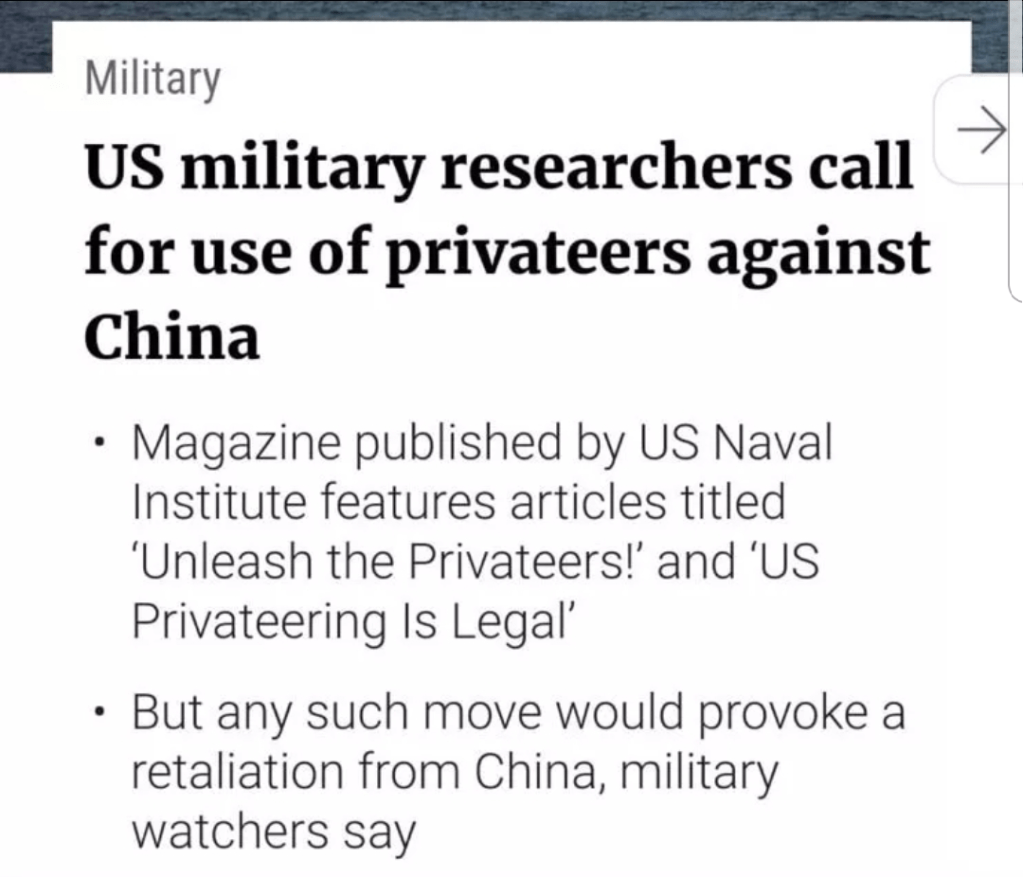 The U.S. Naval Institute is publishing arguments that justify the legality and strategic necessity of sending privateers to attack Chinese merchant vessels.