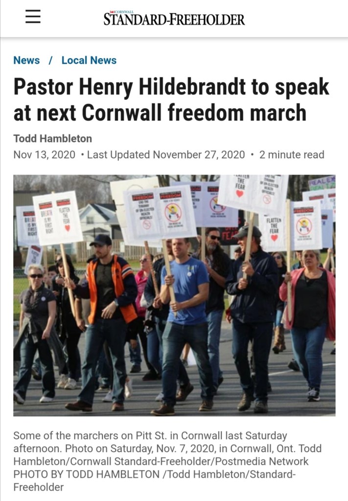 Pastor Henry Hildebrandt of the Church of God, Aylmer is one of the foremost figures of The Line’s anti-lockdown protests in Toronto and Cornwall, ON. The Line (literally) platforms him as he sermonizes to their audience.