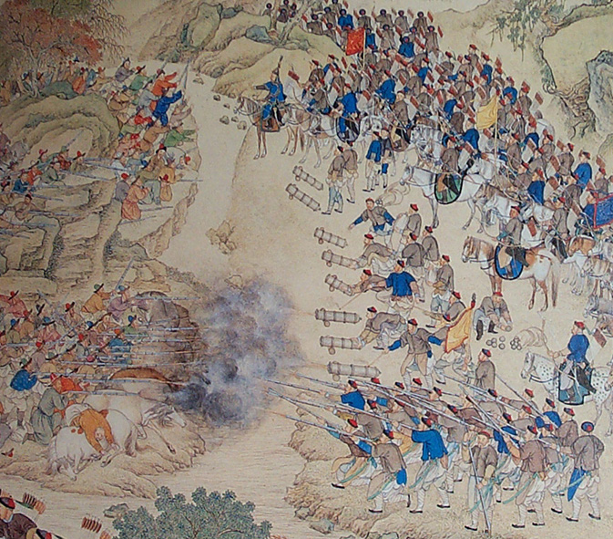 This period came to a close after the Ten Great Campaigns of the Qing dynasty’s Qianlong Emperor. Three of these military campaigns had been directed at the Dzungar Khanate. In 1755 the Qing armies entered the Dzungar capital at Qulja. The Qing soldiers found two Afaqiya brothers held hostage to secure the loyalty of their family: Qilich Burhan al-Din and Khoja Jahan. They would decline Qing offers of vassalage and left for Altïšahr to raise armed resistance. They were defeated in 1757 and Qilich Burhan al-Din was executed in 1759.