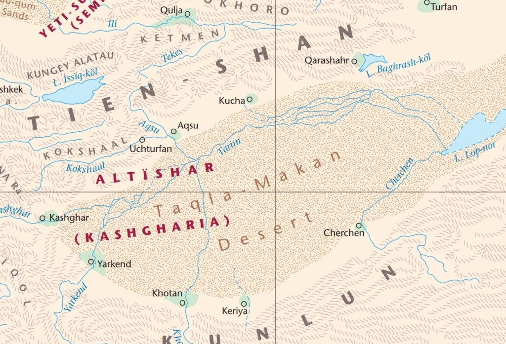 The main setting of our present history is in the southern part of Xinjiang Uyghur Autonomous Region. Separated from the north by the Tianshan mountains, Nanjiang (South Frontier) has been known by many names in its long history. We will concern ourselves primarily with the Six Cities, called Altïšahr in Turkic languages: Aqsu, Uch Turfan, Kashgar, Khotan, Yarkand, and Kucha. These were ancient oasis settlements along the western edge of the uninhabitable Taklamakan Desert.