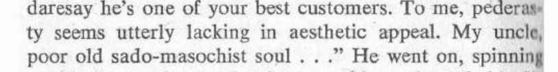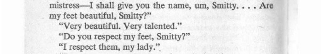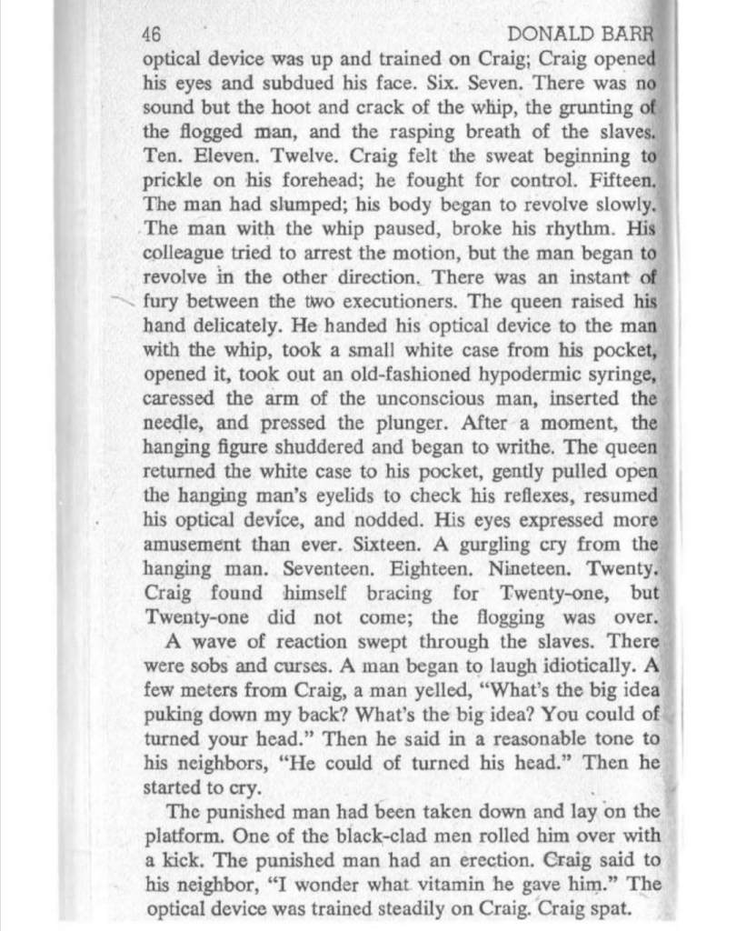 I’ve been skimming a lot because it is straight schlock for many chapters. But that all seems to be narrative bridging for the sake of intensely eroticized scenes of torture and abuse.
