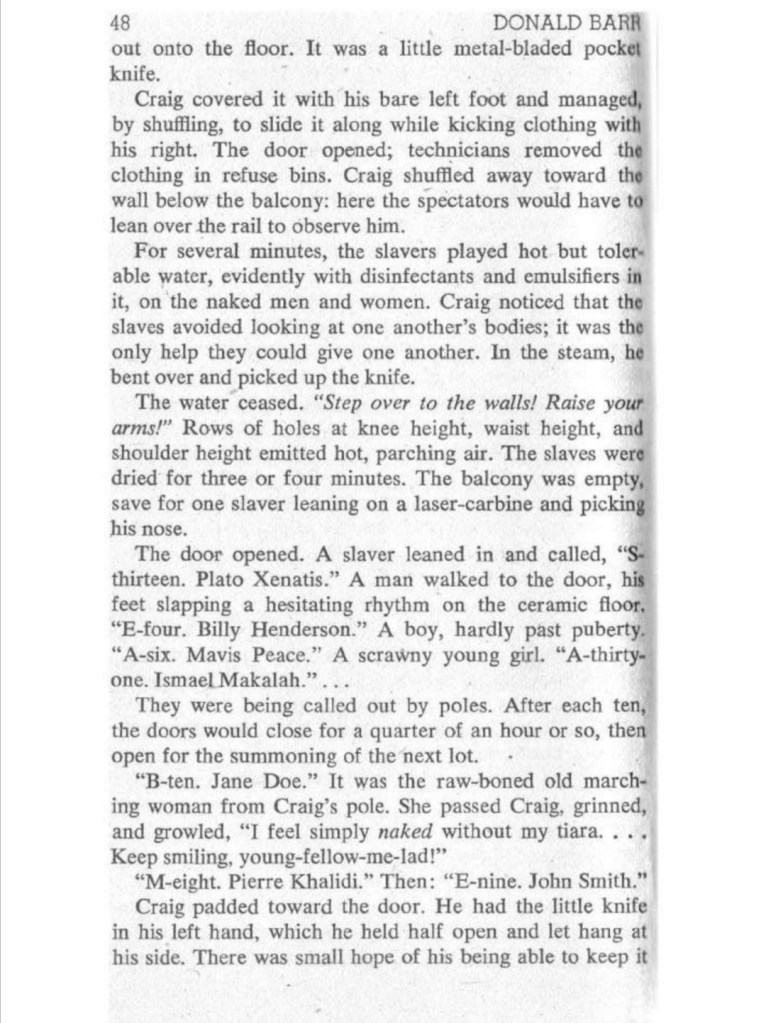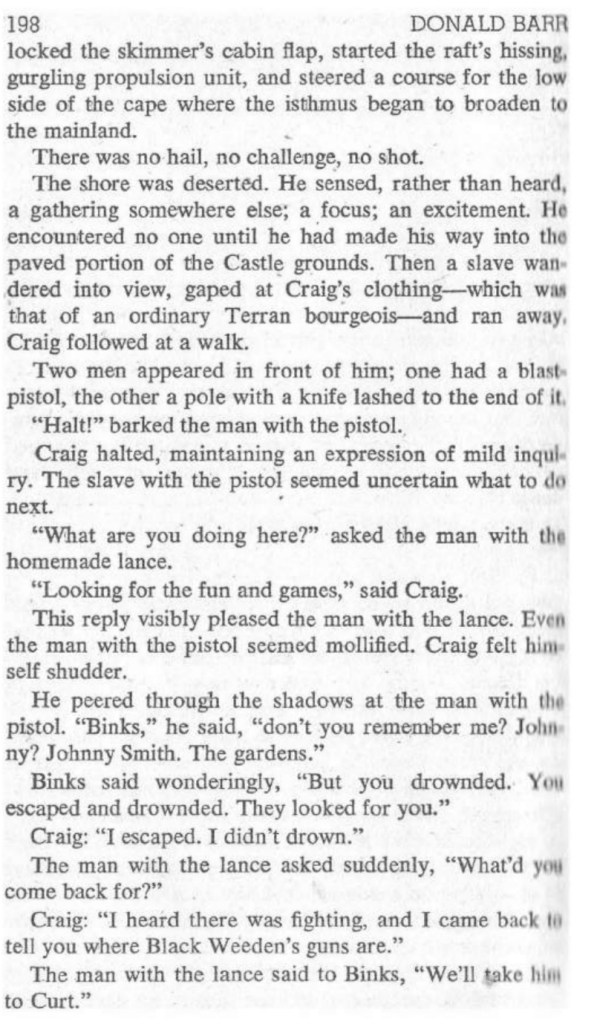 In the next chapter the narrator writes in great technical detail how Craig knocks a rebel guard unconscious, cuts his throat in the most effective way, and then idly wonders if his victim had possessed free will. The dude is not even human to him.