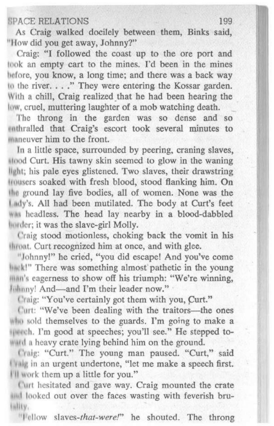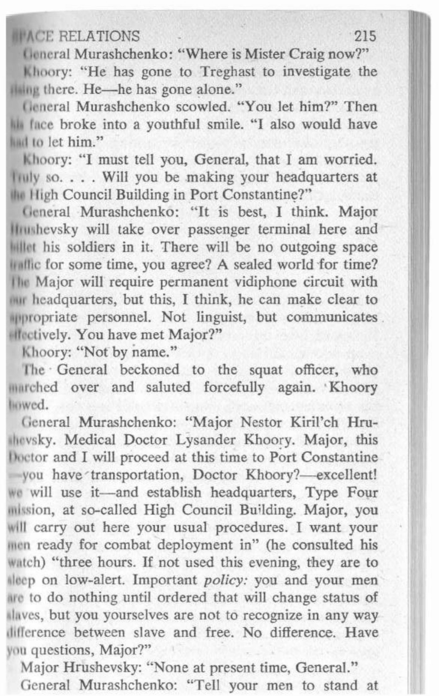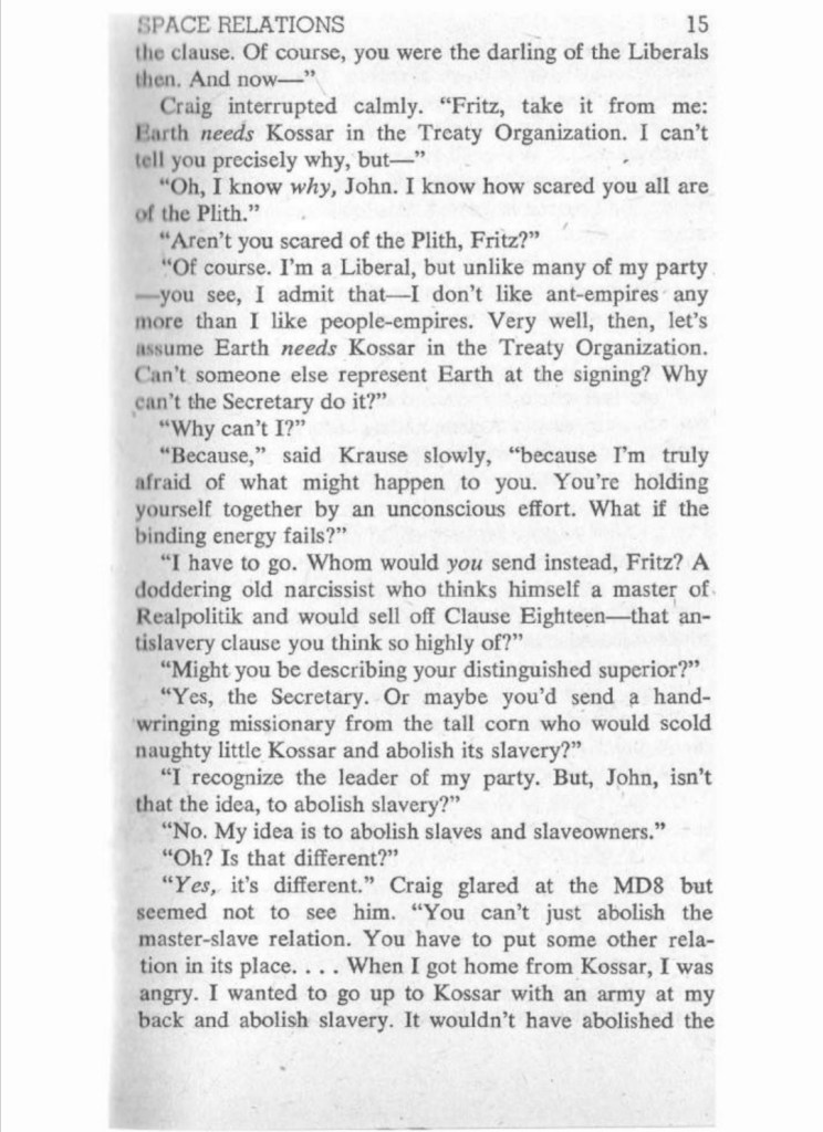 Within the overarching conflict of Humans versus Insects, the contradictions between Kossar and MIPTO are easily overcome. Craig goes to great pains to separate “slavery” from “slaves and slaveowners” as social structures. He laments the loss of Kossar’s Traditionalist elites and his romanticized idea of chattel slavery. But he carries out this transition with an eye to keeping the freedmen servile and the former slavers in command. Reforms which, under the military protection of MIPTO, would preserve the overall structure of Kossar society and prevent revolution.
