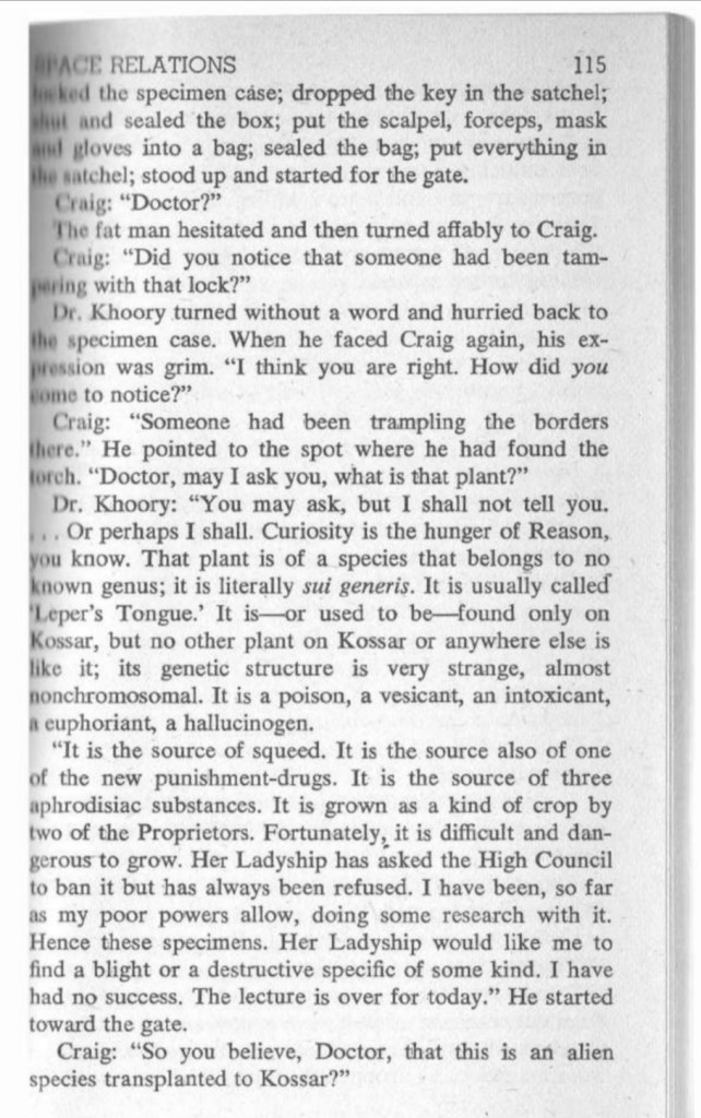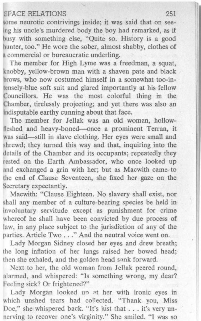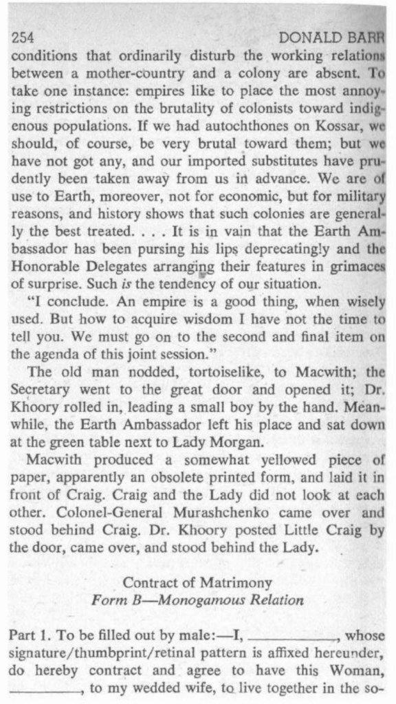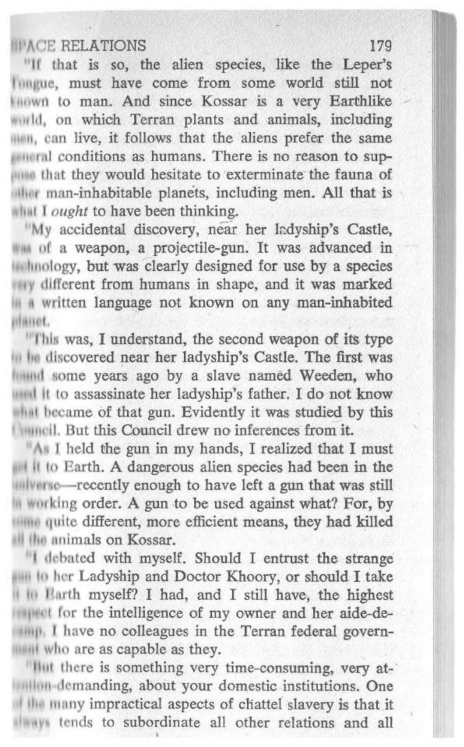 Within the overarching conflict of Humans versus Insects, the contradictions between Kossar and MIPTO are easily overcome. Craig goes to great pains to separate “slavery” from “slaves and slaveowners” as social structures. He laments the loss of Kossar’s Traditionalist elites and his romanticized idea of chattel slavery. But he carries out this transition with an eye to keeping the freedmen servile and the former slavers in command. Reforms which, under the military protection of MIPTO, would preserve the overall structure of Kossar society and prevent revolution.