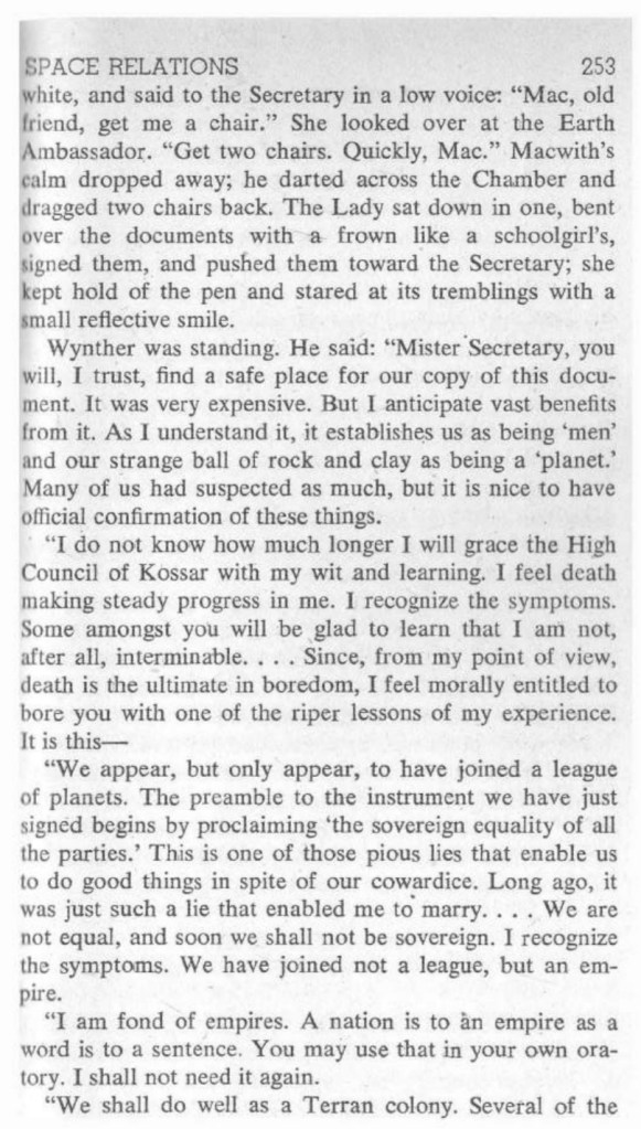 And the Man-Inhabited Planets Treaty is the founding of the MIPTO… Man-Inhabited Planets Treaty Organization (i.e NATO). Craig desperately and apparently irrationally wants Kossar in the MIPTO. He wants them to hold off the ant-empire (Gotta let the arch slavers into NATO if you want to fight the communist hordes from Asia!!)