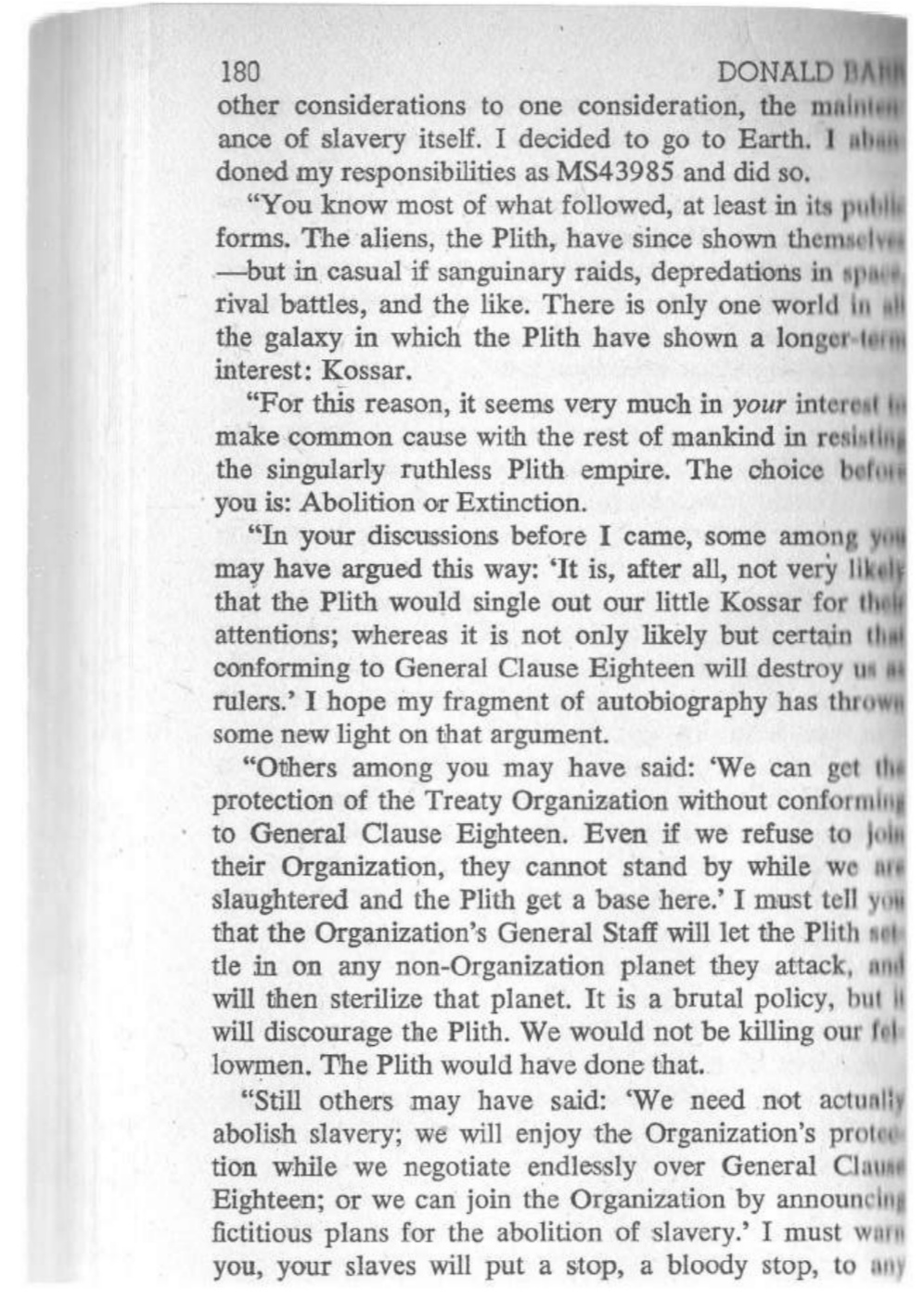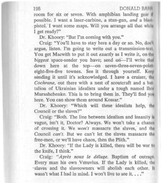 The author has left these clues which draw parallels between Kossar, the Confederacy, and the Third Reich. He gives apologia for the necessity of destroying their beautiful systems of subjugation and mastery. He emphasizes the need to unite against a common enemy, the hive-minded alien masses: he urges them to study and master Class Warfare so that they can defeat the Revolutionaries. And his proposal for the preservation of the ruling class is to grant political freedom to the masses without releasing any economic power. The author’s solution to the class struggle on Kossar is to instate a bourgeois democracy in which real power is held by an oligarchic elite and the masses must struggle to survive.