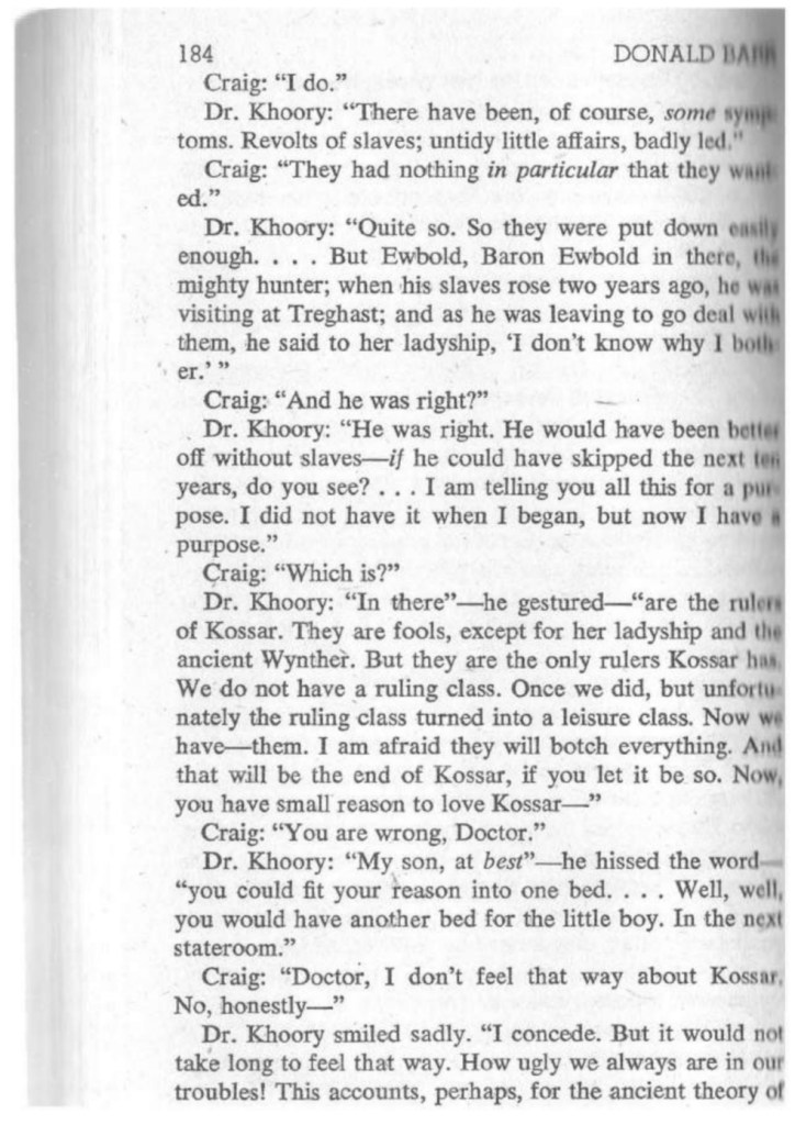 Craig does not want to abolish slavery, he wants to abolish slaves and slaveowners. He believes that the slaves are inherently incapable of governing themselves and must be ruled by those they serve. But he believes that slavery is politically crude and economically inefficient. He actually sees slavery as a beautiful relationship, to be enjoyed by both parties. So he wants to preserve slavery in a society which is politically “free” but economically enslaved: he wants wage laborers toiling under bourgeois capitalism. Craig offers to teach the slaveowners of Kossar how to engage in class war… so that they can emerge from it as a renewed, bourgeois ruling class.
