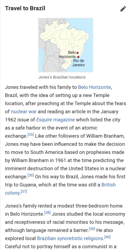Differing accounts say that he went to Hawaii in 1960 and then Cuba and South America. An often repeated story is that he read an article in a 1962 issue of Esquire Magazine which named the 9 places on earth that would be safest from nuclear bombs and fallout. He toured these places, allegedly to see whether the sites were a good place for the People’s Temple to ride out the apocalypse.