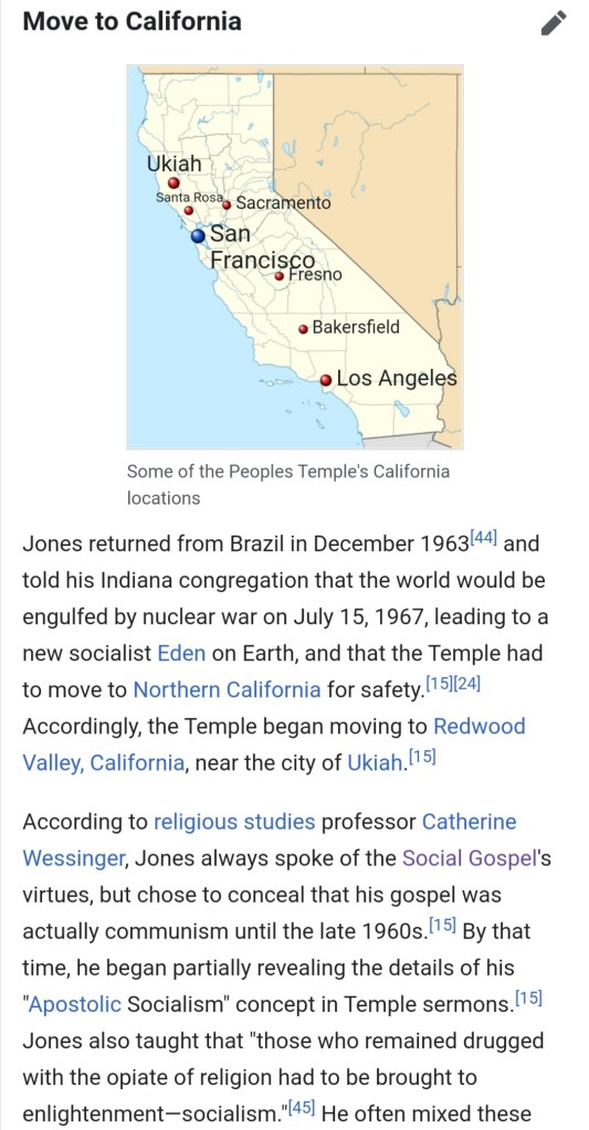 It seems that Jones scouted out all of the prospective locations for his peoples’ commune during his tour of Latin America and the Caribbean (circa 1960-1963). Any one of those locations would have been remote enough to make for a good CIA black site but not necessarily a nuclear shelter. Hawaii is the host of Pearl Harbor, and Ukiah California is in Mendocino County, along with Fort Bragg. These locations would have made attractive nuclear targets, not shelters, because of their proximity to American military bases.