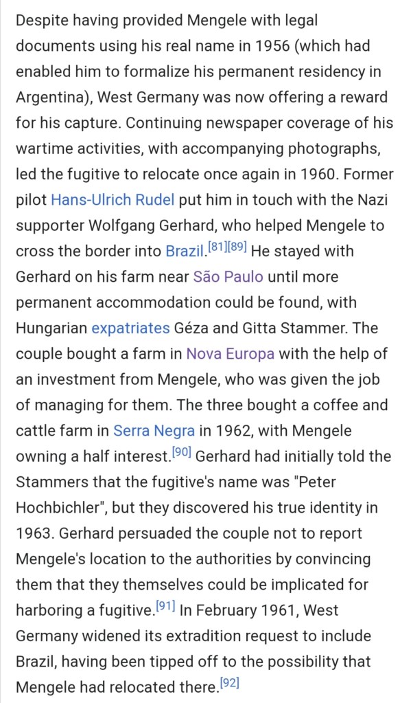 Joseph Mengele fled from Mossad Nazi hunters in 1960 when they nabbed his colleague Adolph Eichmann in Buenos Aires. Mengele took refuge in Sao Paulo. Sao Paulo is the state immediately south of Minas Gerais. Ultimately Mengele was identified by a Nazi living in Minas Gerais who supplied SS documents that matched Mengele’s handwritten notes found in Sao Paulo.
