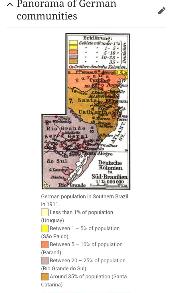 The southern states of Brazil are sites of many German colonies which were established in the 19th century. In 1911 Santa Catarina had a 35% German plurality and Rio Grande do Sol had a 20-25% German population.