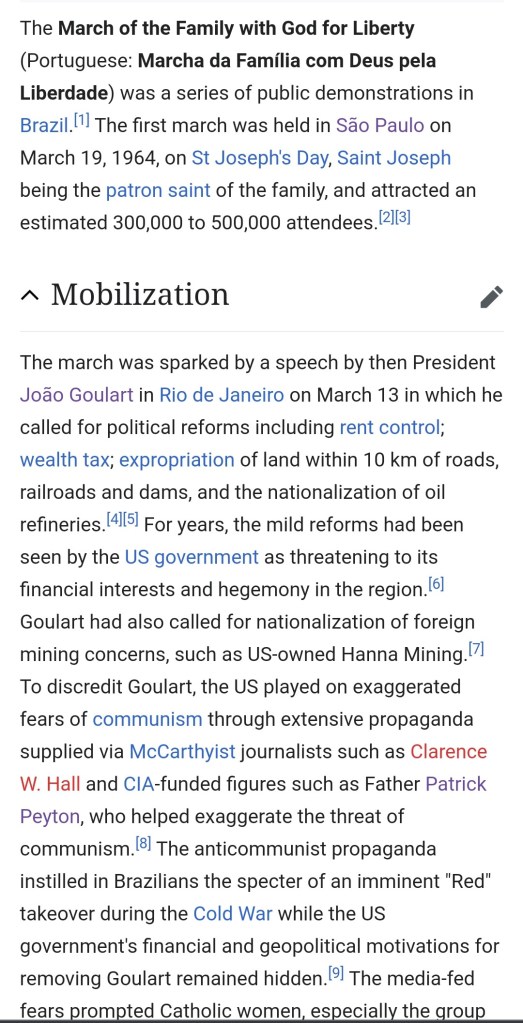 This march was one of the triggers of the coup. It was a result of “Operation Brother Sam” launched in 1961 by the CIA, probably with some liberal interpretation of things Kennedy said about the newly elected Brazilian president.