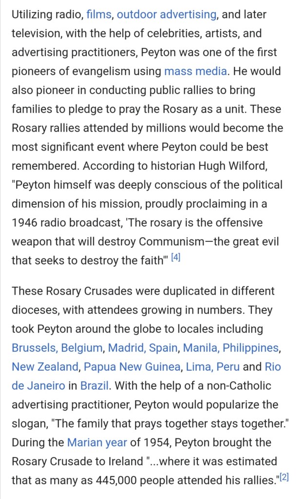 It was stirred up by American religious figures and local propaganda outlets including Patrick Peyton of the Catholic Church, presently a candidate for sainthood.