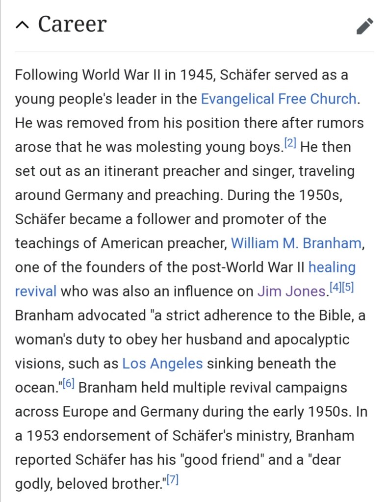 Paul Schaefer, former Nazi and founder of Colonia dignidad, was a student of William Branham, the same pentecostal preacher who taught Jim Jones how to do faith healings and psychic discernments.