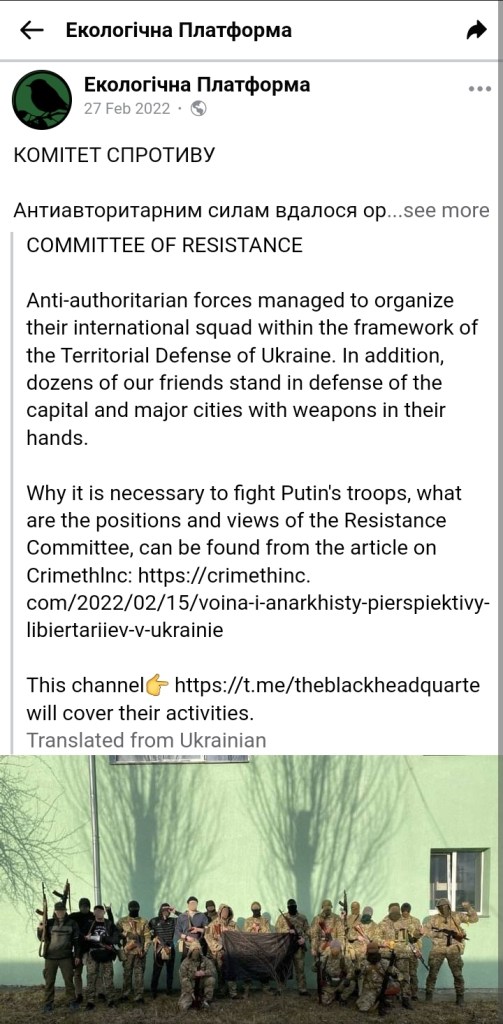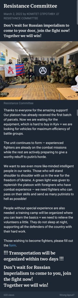 Of course, like any good anarchists, the Resistance Committee is organizing the international brigade under command of the Ukrainian state’s Territorial Defense Forces: