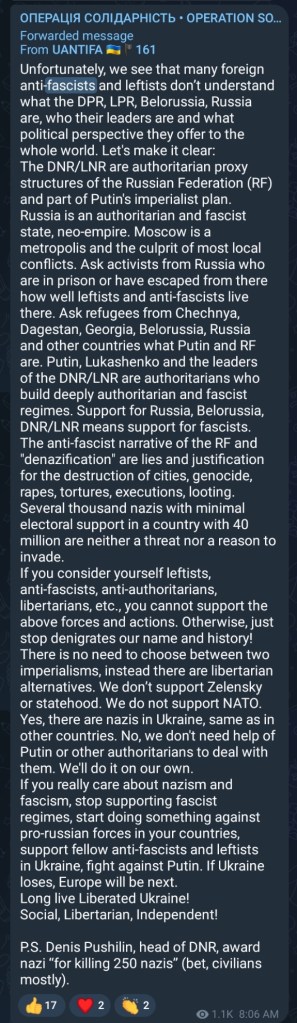 I noticed that Operation Solidarity says “antifascist” a lot on their Telegram channel but almost always referring to Putin and Russia. I searched for “Azov,” “Aidar,” “C14,” but found no mention of these infamous domestic fascists in English or in Ukrainian.
