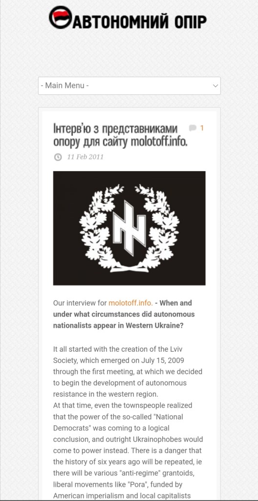 While I was exploring the vast complex of right wing political groups in Ukraine I came upon a bizarre, seemingly impossible group that I had to know more about. Avtonomniy Opir (AO), “Autonomous Resistance” hosted this 11 Feb 2011 interview with molotoff.info on their website: