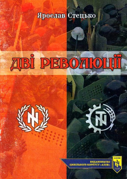 The new SNPU was evidently an integral part of the growing Azov Movement. In 2016 the Azov Civil Corps published a new edition of Yaroslav Stetsko’s Two Revolutions which featured the Ukrainian Wolfsangel and the National-Trudovik symbol on its cover.