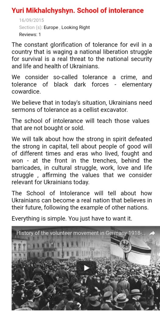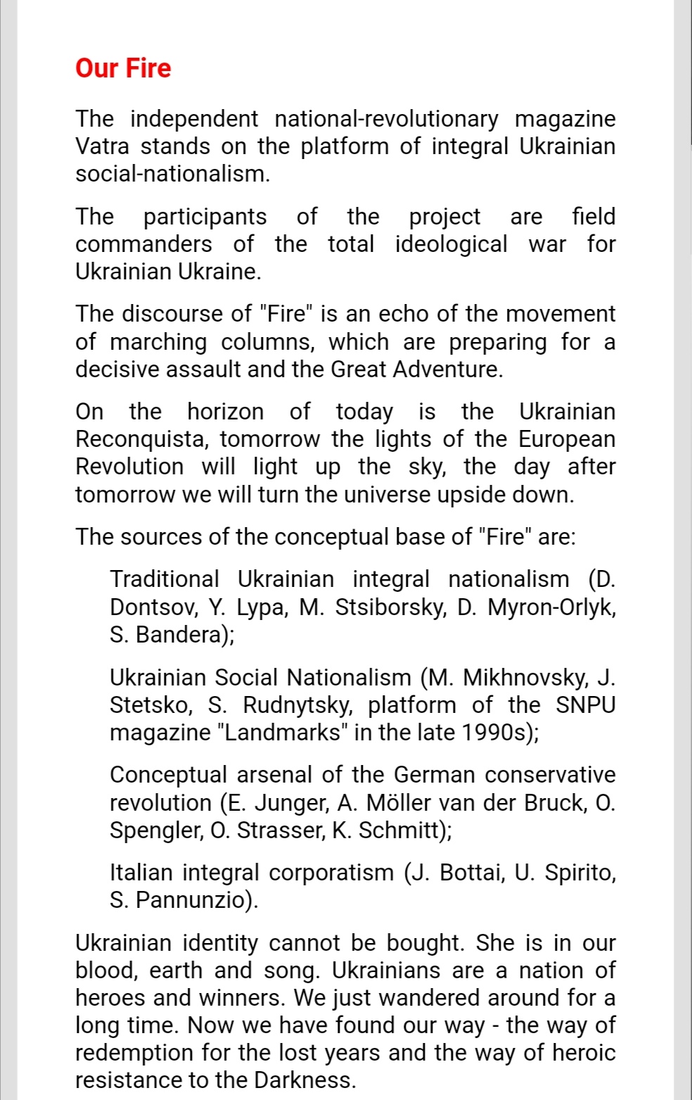Unfortunately we cannot find much more on Vatra at this time. It is part of a network of affiliated websites, some of which have obvious relevance to the subject of “revolutionary social nationalism.” The website’s sidebar links to Deputy Mikhalchyshyn’s page, ecofascist poetry, a handmade trinket shop in Lviv, and more. Vatra calls itself a “revolutionary nationalist journal” but at this time we don’t know whether it was an outlet of a large network or if it was written by a small circle of correspondents. It is at the very least indicative of an actually-existing neonazi subculture.
