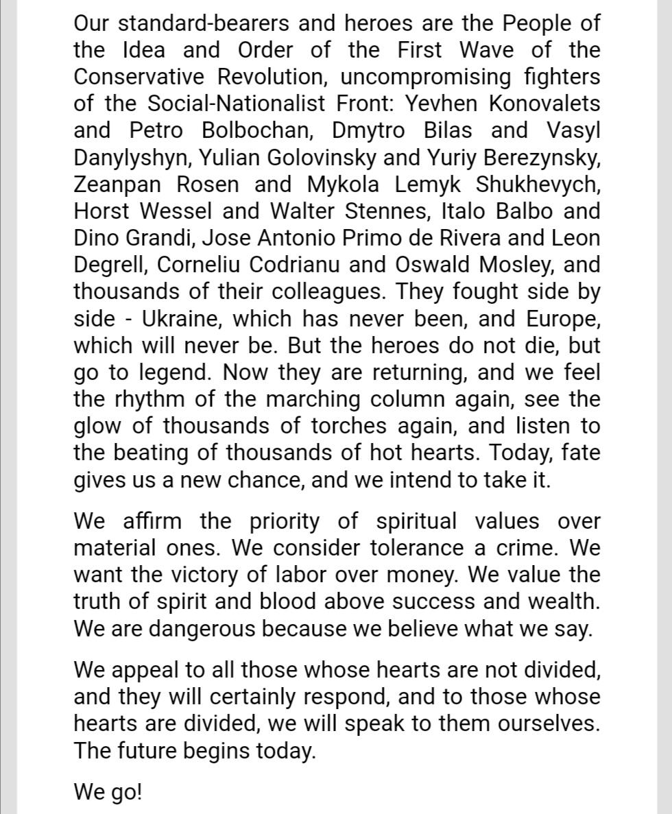 Integral Nationalism. Social Nationalism. German right-wing radical theory. Italian Corporatism. These are the ideological foundations of the Banderites, the Neonazis, the German National Socialists, and the Italian Fascists, respectively. They also emphasize that they “affirm the priority of spiritual values over material ones,” a common refrain in many reactionary ideologies as a refutation of Marxism’s dedication to material analysis and material gains for the working masses.