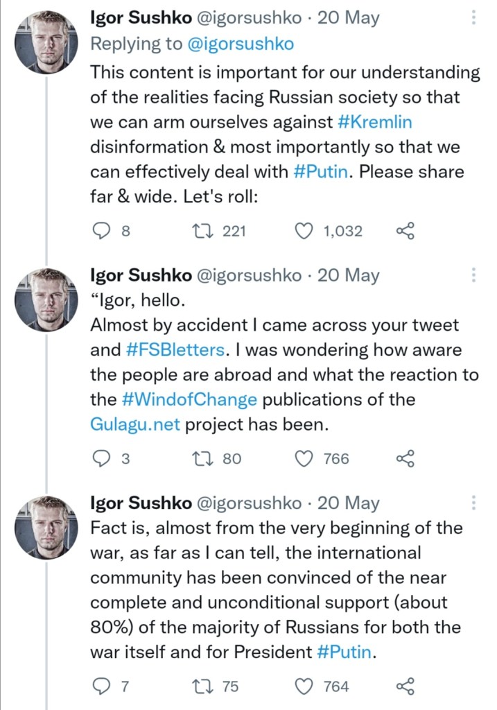 At 20:30 Sushko tells us why we shouldn’t believe the naysayers about the Wind of Change: he says that the FSB has been waging a disinformation campaign to discredit the FSB Letters. The critics are an op!