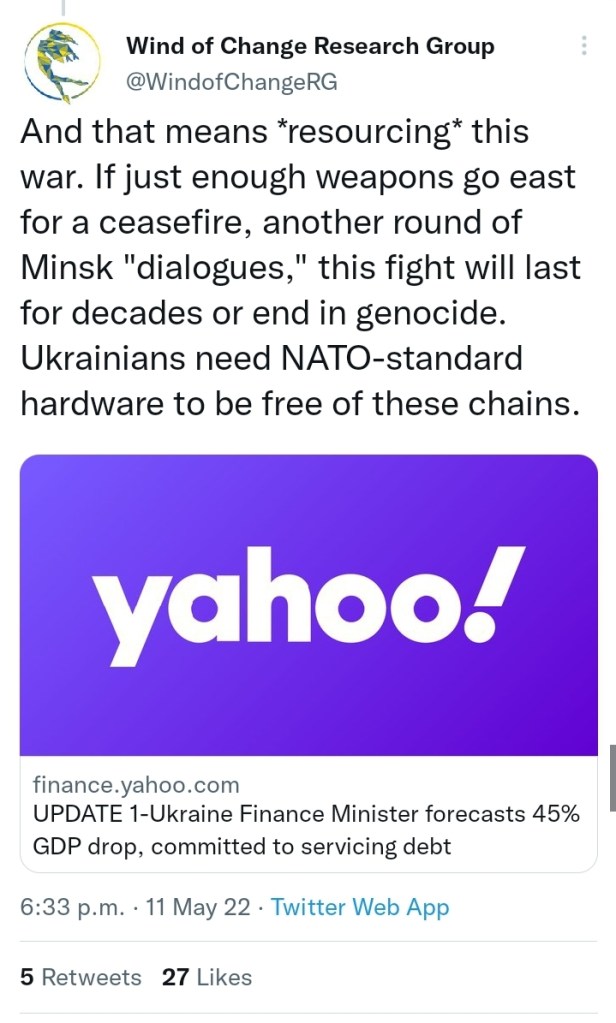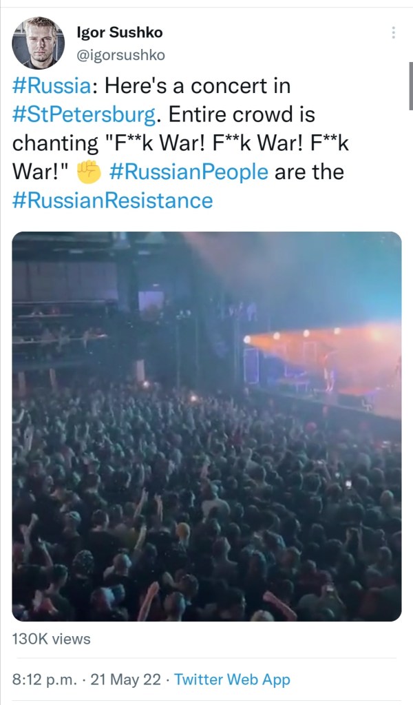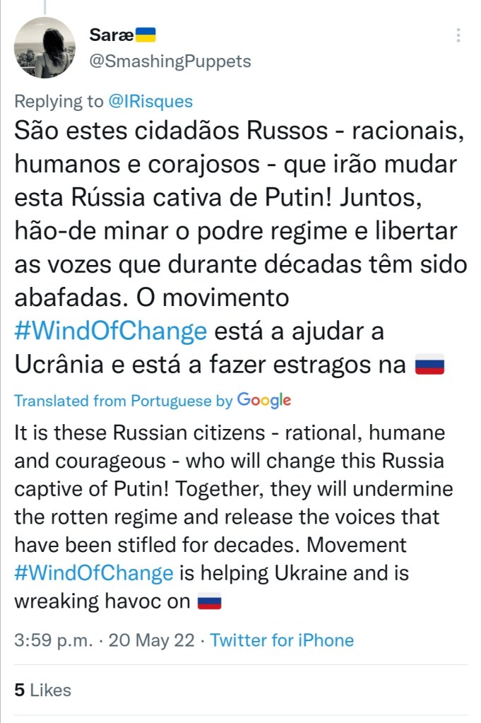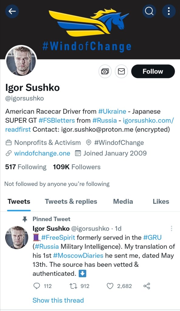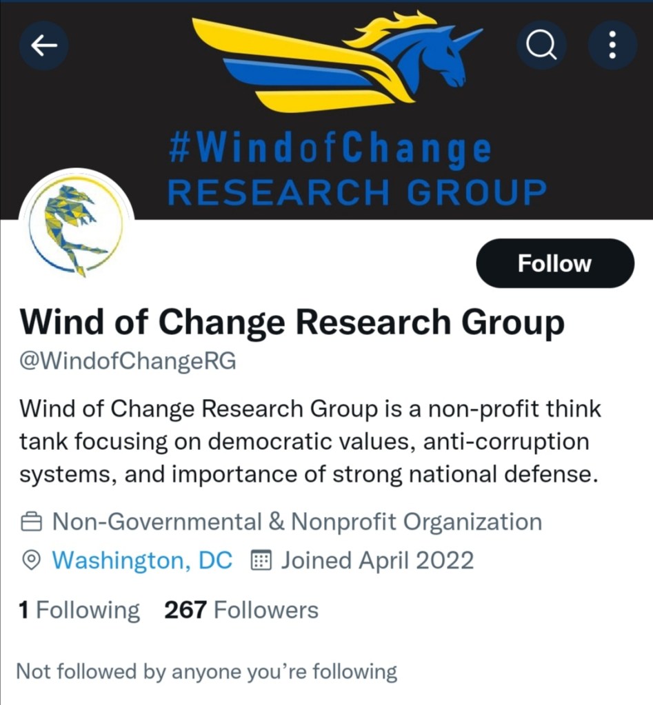 Wind of Change RG appears to have been created after the start of the Russo-Ukrainian war, with its twitter account created two months into the war and only 17 tweets posted (all made on 11 May). The account only follows one person: Igor Sushko. It also uses the #RussianResistance hashtag, which appears in connection with WoC and Sushko so often that one might suspect it to be a social media project of the think tank.