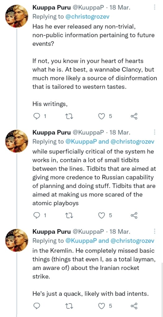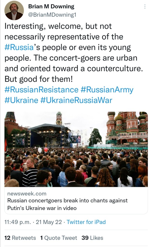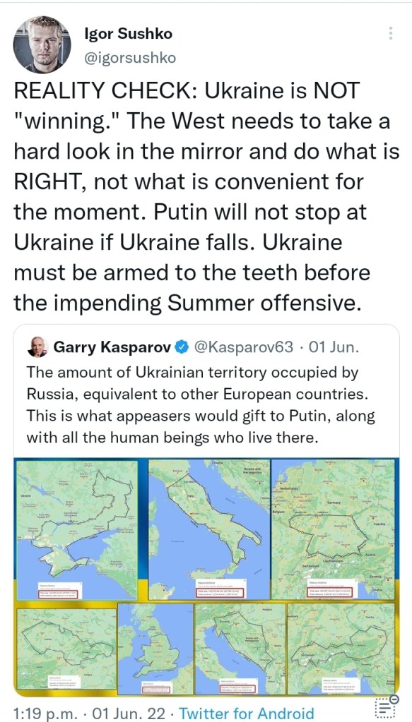 After this Sushko does try to explain why the FSB Letters failed to predict Russia’s failure to take Kiev. He says that the FSB Letters, being based on FSB analysis, suffers from the same “flaws of hubris” as the rest of Russian intelligence, which thought the war would be easy.