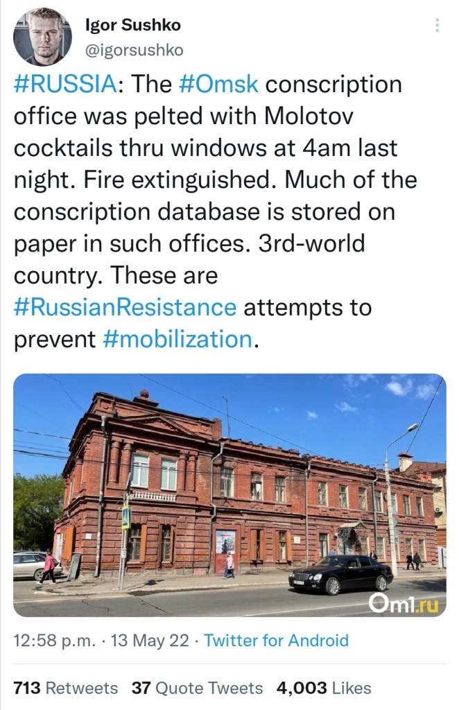 The possibility of a “#RussianResistance” carrying out acts of arson against military targets is one that I felt an obligation to investigate. Naturally I started by checking out the hashtag. The above tweet was the first result and these ones round out the top ten: