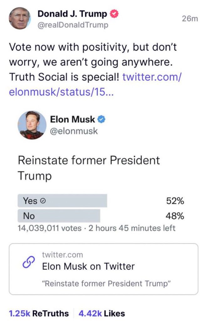 @realDonaldTrump was one of the most sensationally offensive and popular accounts on Twitter. Many users left the site after Trump was banned — not only his conservative supporters but also connoisseurs of fine shitposts. Unfortunately for Elon the Trump train has left the station. The former president and his followers will stay on his proprietary ripoff of Mastodon, Truth Social.