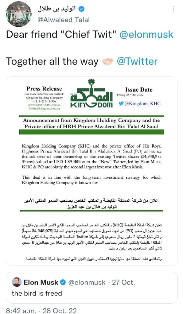 Elon was able to convince Alwaleed that he could realize Twitter’s potential. Rather than take the cash Alwaleed pledged to reinvest his $1.9B in the new Twitter. He now owns about 4% of the company and is its second largest shareholder.