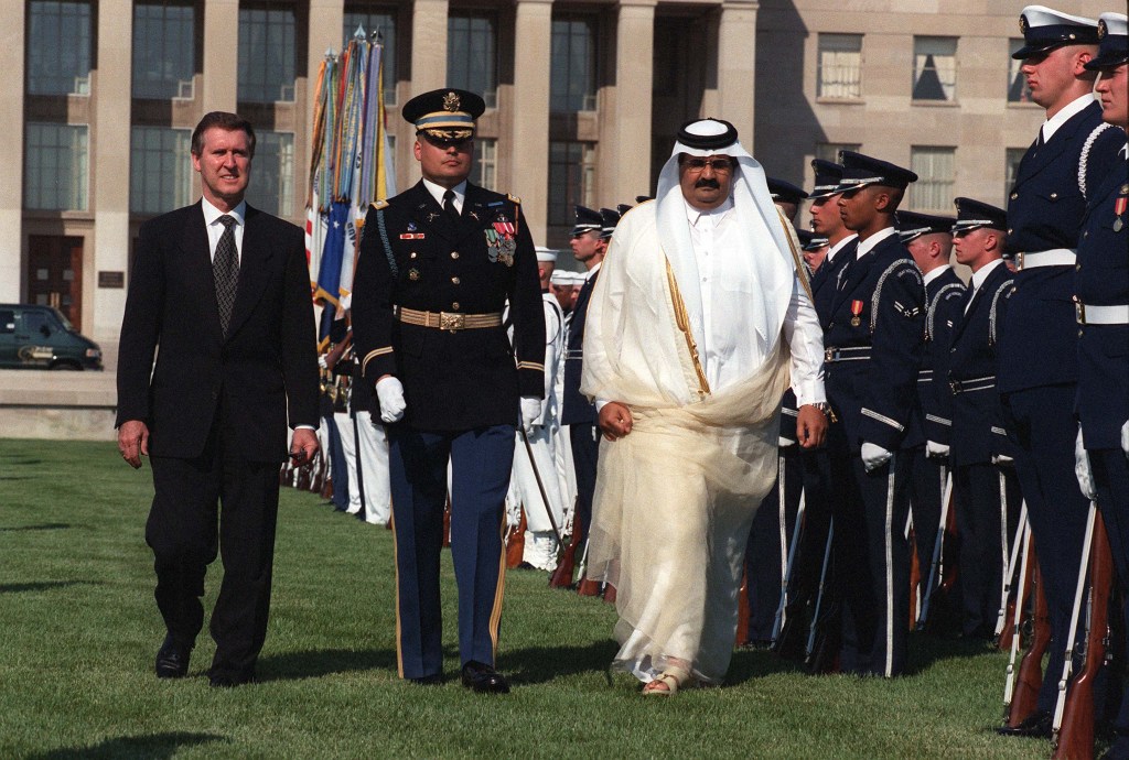 William Cohen, Lt. Col. Michael Chura, and Emir Hamad bin Khalifa at the Pentagon, June 1997. From Defense.gov via Wikimedia Commons.