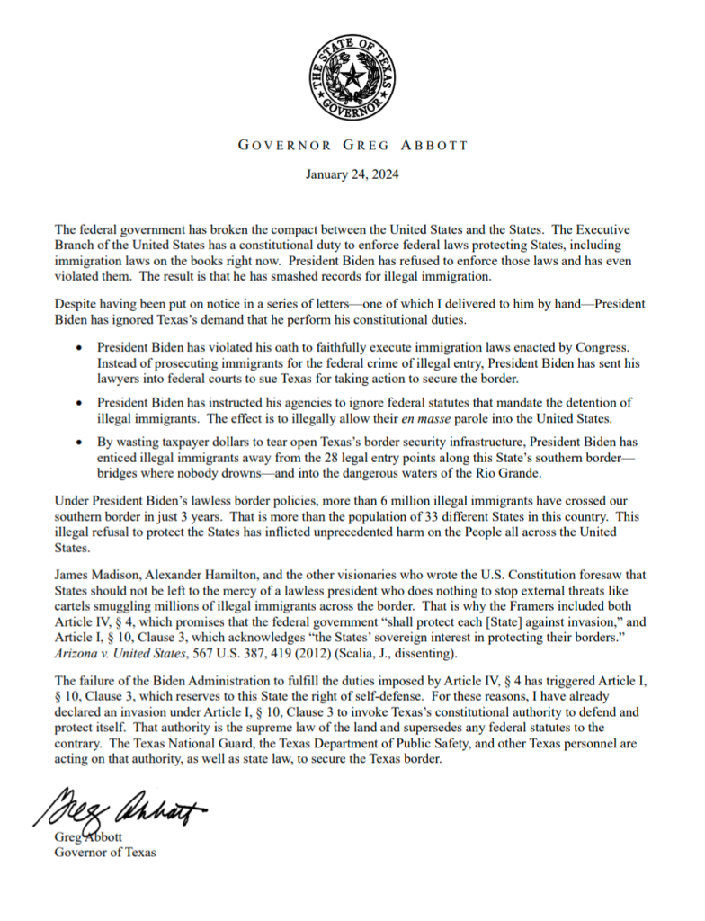 On January 24 Governor Abbott issued a statement, saying that “the federal government has broken the compact” with the States by failing to protect them from an “invasion.” Abbott declared that Texas was being invaded by migrants, coordinated by terrorist organizations, and that Article I of the Constitution guaranteed Texas’ “sovereign interest” in defending it’s own border.