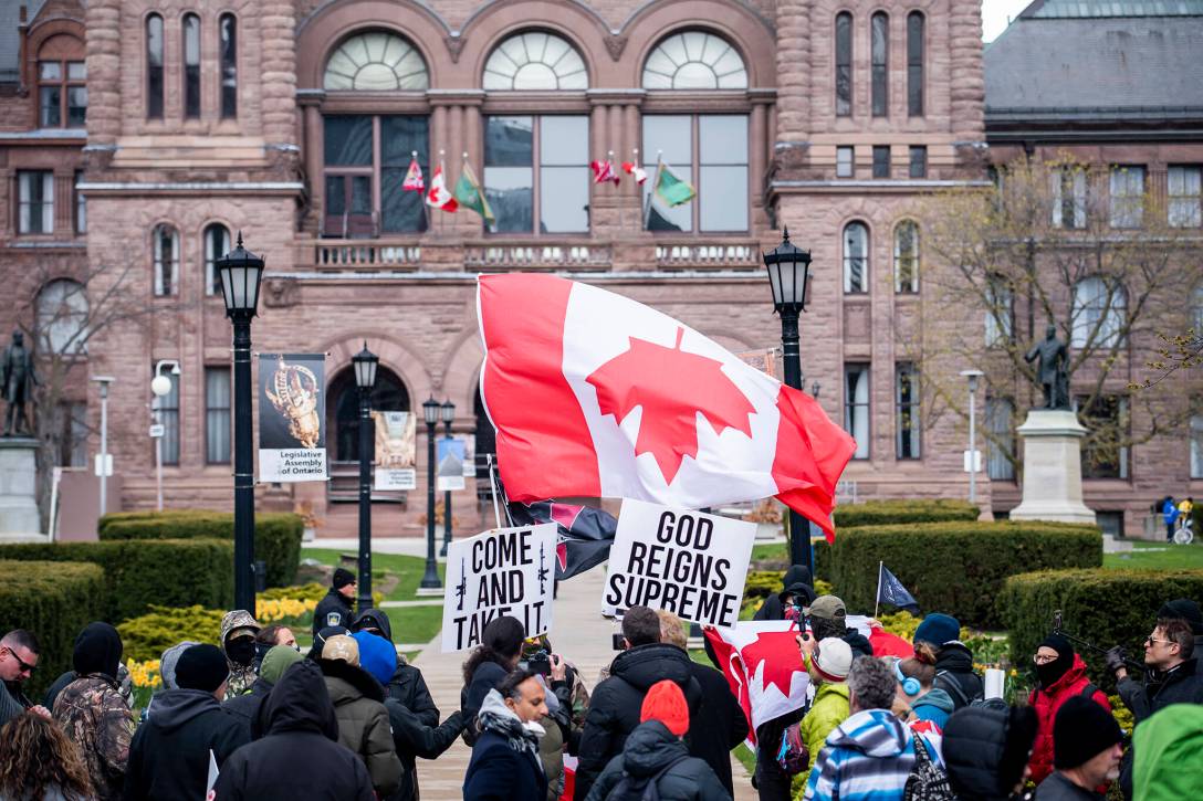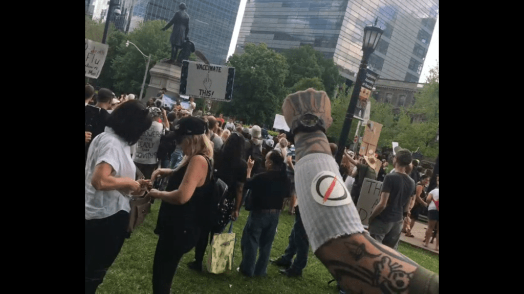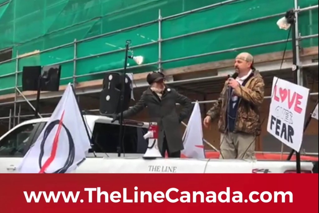 THE LINE Canada organizes weekly protests against the COVID-19 lockdowns in Toronto’s Dundas Square. THE LINE urges people to struggle under its logo, which echoes right wing movements in the British Empire.