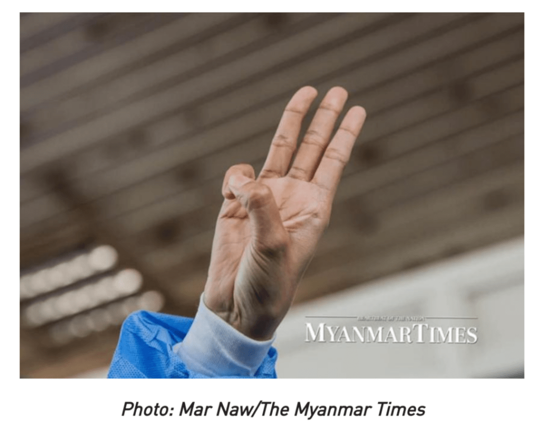 Giving the Three-Finger Salute February 16, 2021February 16, 2021 Norene WeaverLeave a comment The three finger salute thrown by protesters in Myanmar struck a familiar chord. No, not because it's the salute used in The Hunger Games.
